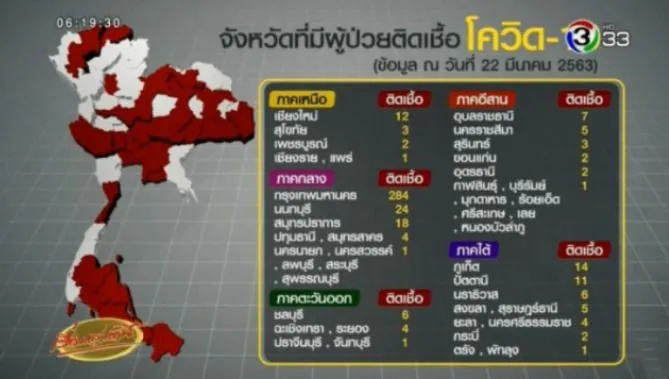 ล่าสุด เมื่อวันที่ 22 มีนาคม 2563 พบผู้ติดเชื้อแล้วใน 42 จังหวัด ทั้งภาคเหนือ ภาคกลาง ภาคตะวันออก ภาคอีสาน และภาคใต้ ทั้งนี้พื้นที่ที่มีผู้ติดเชื้อมากสุดอยู่ในภาคกลาง ได้แก่ กรุงเทพมหานคร 284 ราย นนทบุรี 24 ราย สมุทรปราการ 18 ราย ขณะที่ภาคใต้ ภูเก็ต 14 ราย ปัตตานี 11 ราย ส่วนที่ภาคเหนือ เชียงใหม่ 12 ราย