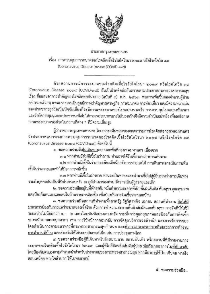วันที่ 23 มีนาคม 2563 ทางพลตำรวจเอก อัศวิน ขวัญเมือง ผู้ว่าราชการกรุงเทพมหานคร ได้ออกประกาศกรุงเทพมหานคร เรื่อง การควบคุมการระบาดของโรคติดเชื้อไวรัสโคโรนา 2019 หรือ โรคโควิด 19