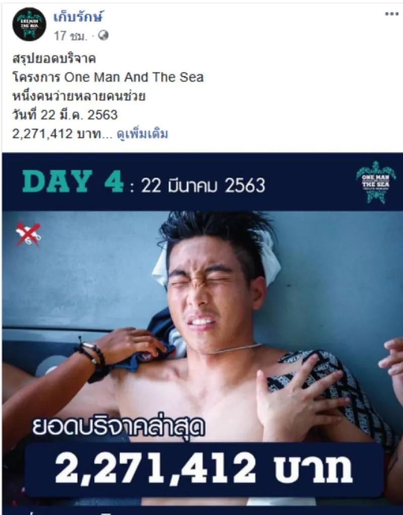 ล่าสุดเมื่อวันที่ 22 มีนาคม 2563 ที่ผ่านมา ในระหว่างที่ โตโน่ ภาคิน ว่ายน้ำข้ามเกาะเป็นวันที่ 4 เจ้าตัวก็มีอาการบาดเจ็บ จนต้องหยุดพักกลางคัน เพื่อไปทำกายภาพบำบัด ก่อนจะขอไปว่ายน้ำต่อในช่วงบ่าย ซึ่งทางเพจ เก็บรักษ์ ได้โพสต์อัปเดตว่า