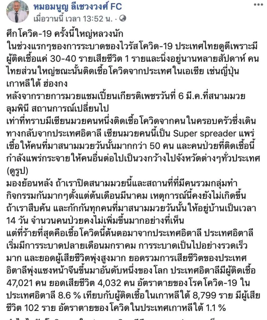 ล่าสุดทางเพจเฟซบุ๊ก “หมอมนูญ ลีเชวงวงศ์ FC” ได้โพสต์ข้อความเกี่ยวกับสถานการณ์ โควิด-19 ว่า การระบาดจากสนามมวย ต้นตอมาจาก ลูกชายเซียนมวยคนหนึ่งที่มาจากอิตาลี และสายพันธุ์ โควิด -19 อิตาลี แตกต่างจากสายพันธุ์ประเทศจีน และเซียนมวยรายนี้ได้กลายเป็น super spreader โดยมีรายละเอียดข้อความดังนี้