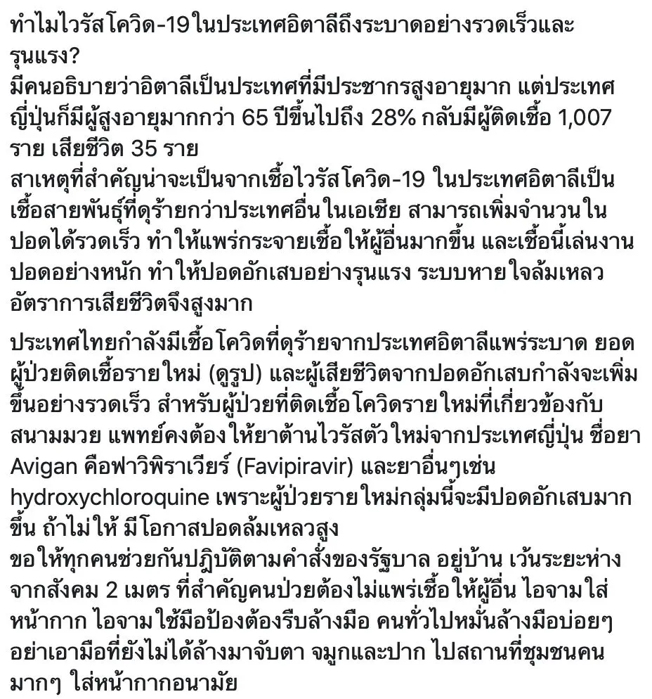 มีคนอธิบายว่าอิตาลีเป็นประเทศที่มีประชากรสูงอายุมาก แต่ประเทศญี่ปุ่นก็มีผู้สูงอายุมากกว่า 65 ปีขึ้นไปถึง 28% กลับมีผู้ติดเชื้อ 1,007 ราย เสียชีวิต 35 ราย