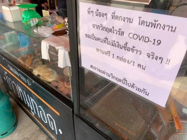 มีข้อความระบุว่า เปิดให้บริการทุกวันนะครับ พี่ๆน้องๆท่านได้ ที่ตกงาน โดนพักงานจากวิกฤต COVID 19 เชิญมาท่านข้าวที่ร้านฟรี ขอเป็นคนที่ไม่มีจริงๆนะครับ ขอเป็นกำลังใจให้พี่ๆน้องๆ สู้กับวิกฤตนี้ไปด้วยกันนะครับ เราจะผ่านวิกฤตนี้ไปด้วยกัน