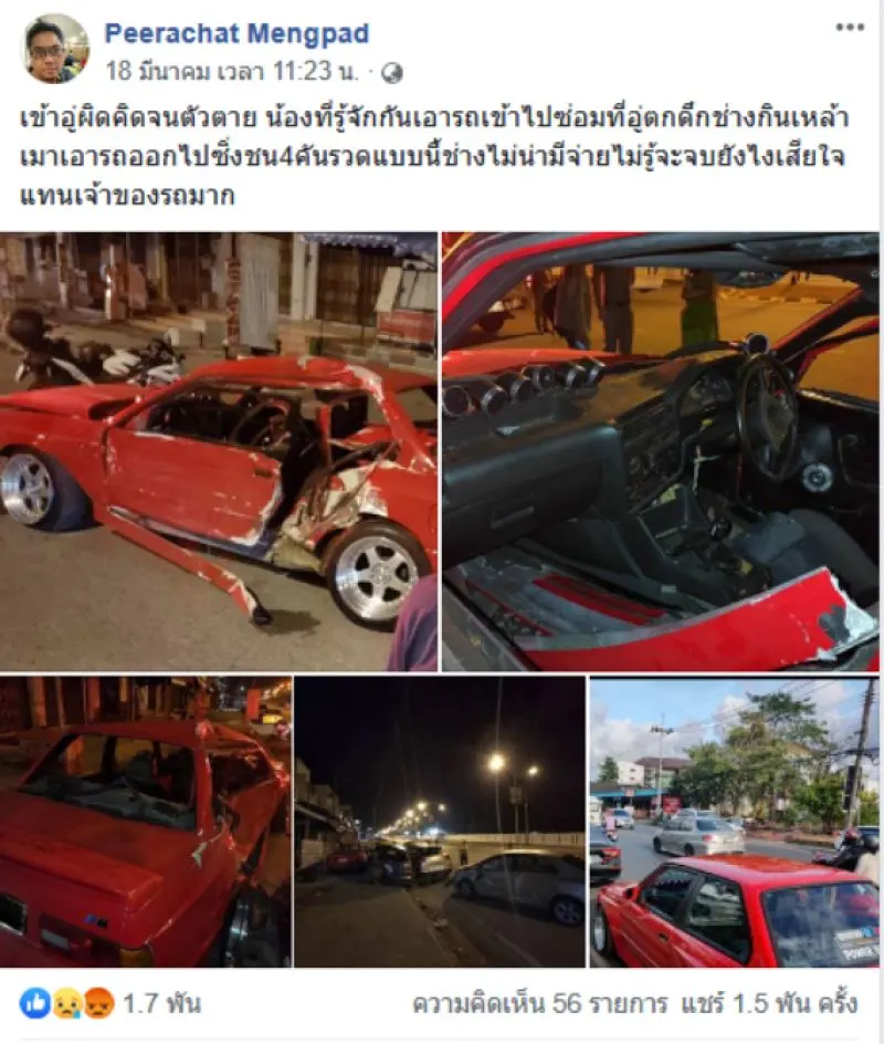 วันที่ 23 มีนาคม 2563 ทีมข่าว siamnews ได้รับรายงานว่า จากกรณีผู้ใช้เฟซบุ๊กชื่อ Peerachat Mengpad ได้ดฑสต์ภาพของสภาพรถพร้อมระบุข้อความว่า น้องที่รู้จักกันเอารถเข้าไปซ่อมที่อู่ตกดึกช่างกินเหล้าเมาเอารถออกไปซิ่งชน4คันรวดแบบนี้ช่างไม่น่ามีจ่ายไม่รู้จะจบยังไงเสียใจแทนเจ้าของรถมาก