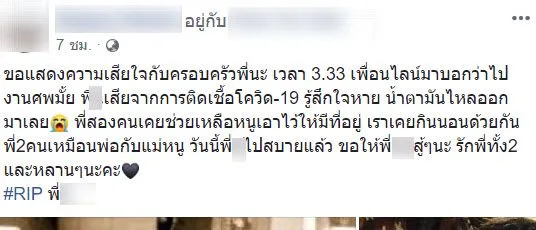 ทั้งนี้คนใกล้ชิดยังได้โพสต์อาลัยอีกว่า “ขอแสดงความเสียใจกับครอบครัวพี่นะ เวลา 3.33 เพื่อนไลน์มาบอกว่าไปงานศพมั้ย พี่(ชื่อผู้เสียชีวิต) เสียจากการติดเชื้อโควิด-19 รู้สึกใจหาย น้ำตามันไหลออกมาเลย พี่สองคนเคยช่วยเหลือหนูเอาไว้ให้มีที่อยู่ เราเคยกินนอนด้วยกัน พี่ 2 คนเหมือนพ่อกับแม่หนู วันนี้พี่ไปสบายแล้ว ขอให้ (แฟนผู้เสียชีวิต)สู้ๆนะ รักพี่ทั้ง 2 และหลานๆนะคะ #RIP”