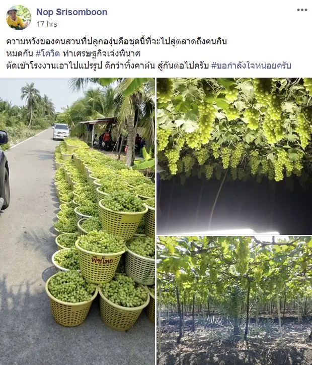 โดยทางผู้ใช้เฟซบุ๊ค Nop Srisomboon ซึ่งเป็นเจ้าของไร่องุ่น ได้โพสต์ระบายความทุกข์ใน กลุ่มคนอยากทำเกษตร ความหวังของคนสวนที่ปลูกองุ่นคือชุดนี้ที่จะไปสู่ตลาดถึงคนกิน