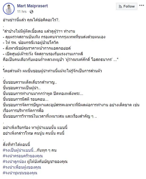 อ่านข่าวนี้แล้ว คุณได้ข้อคิดอะไร? ลำปางไม่มีผู้ติดเชื้อเลย แล้วดูผู้ว่าฯ ทำงาน