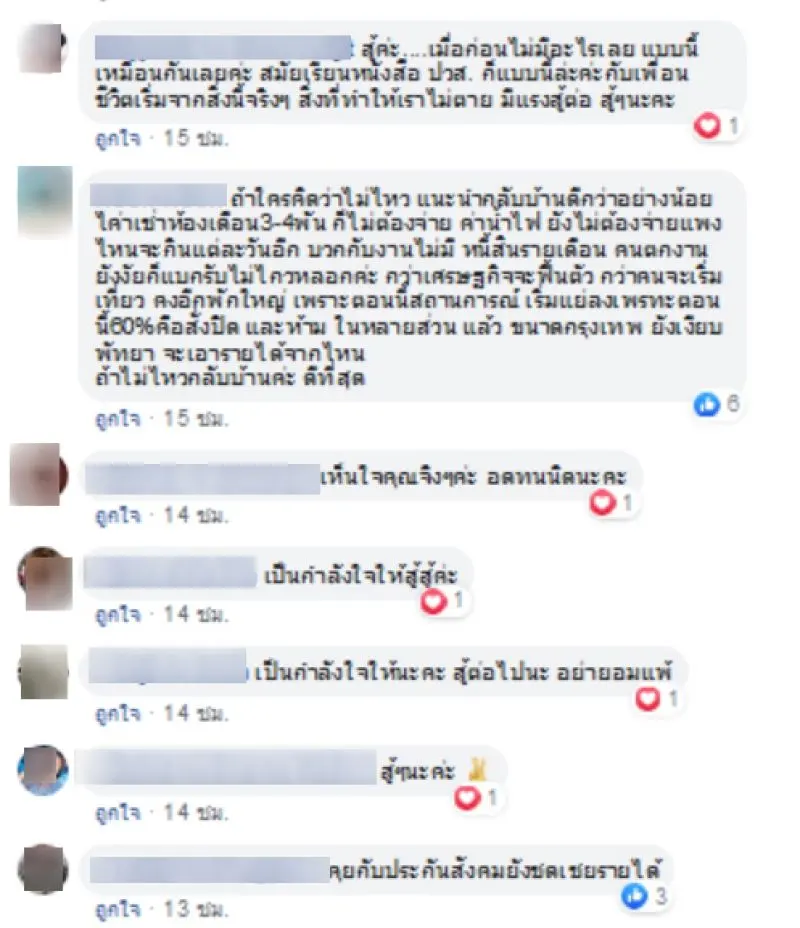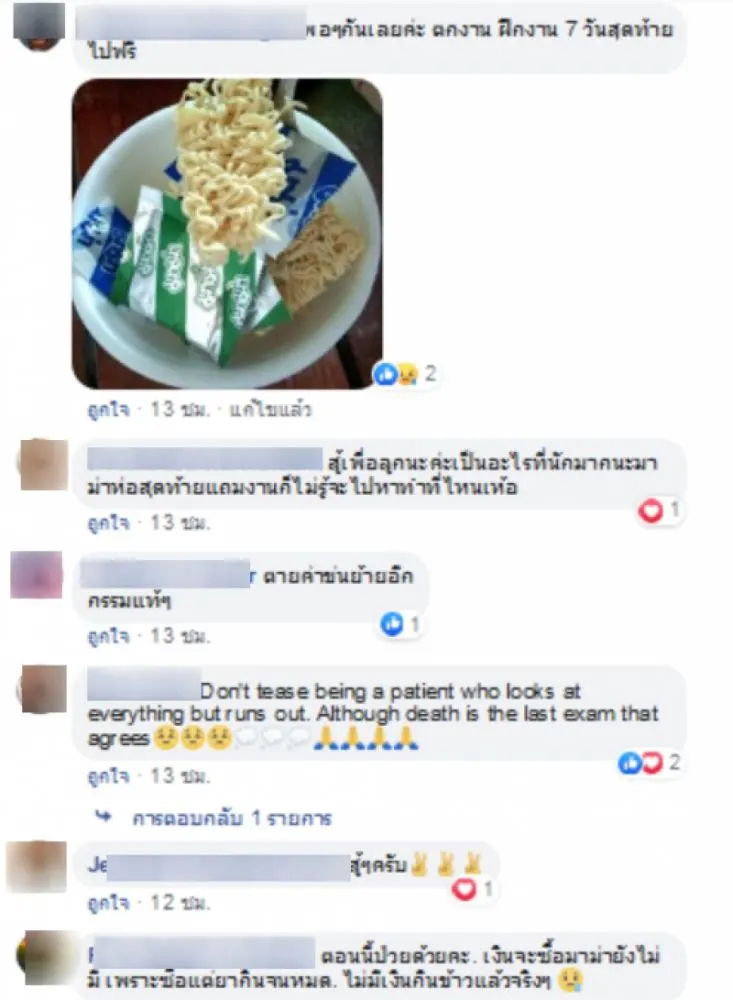สุดท้ายต้องตายอยู่นี่จริงเหรอ เน็ตยังต้องเล่นเน็ตฟรีที่พอจะมีไว้ดูความเคลื่อนไหวต่างๆ ว่าจะมีหน่วยงานไหนช่วยเราได้บ้าง แต่เปล่าเลยไม่มีเลยเราต้องช่วยตัวเราเอง วันนี้บะหมี่ห่อสุดท้าย ข้าวติดถังอยู่ได้อีกกี่วันไม่รุ้ ตอนนี้ที่อยากได้ที่สุดคือเห็นน่าบุตร อยู่กับแม่ทำไมรัฐไม่สนใจคนจนแบบเราบ้าง สู้มาเต็มที่แล้วจริงๆ