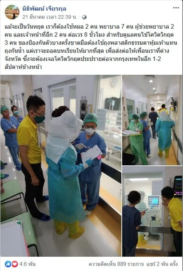 ล่าสุด โดยผู้ใช้เฟซบุ๊ค นิธิพัฒน์ เจียรกุล ได้โพสต์ภาพผ่านเฟซบุ๊ค ซึ่งเป็นภาพของการทำงานของเจ้าหน้าที่และคุณหมอของทาง รพ ศิริราช ที่ต่างทำงานกันอย่างเหน็ดเหนื่อยและไม่มีชุดป้องกันตัวเอง จนต้องดัดแปลงวัสดุ โดยใช้ถุงพลาสติกมาหุ้มเท้าแทนถุงกันน้ำ พร้อมระบุข้อความว่า