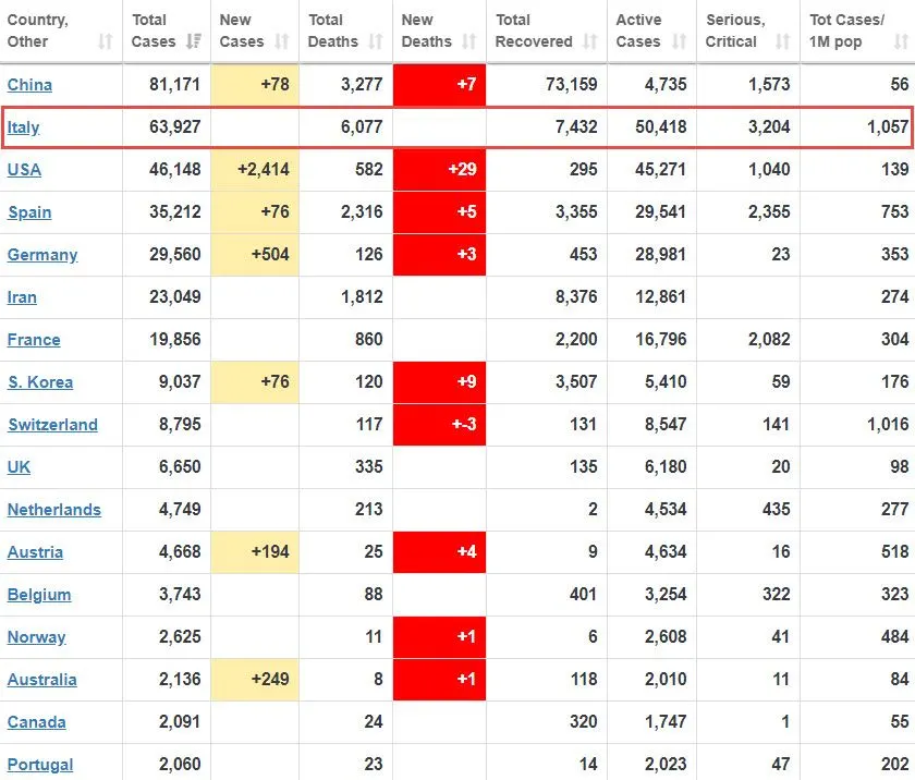 ทั้งนี้ อิตาลี ถือเป็นประเทศในยุโรปที่มีผู้ติดเชื้อเยอะที่สุดในโซนยุโรป ซึ่งข้อมูลแจ้งว่า อิตาลีมีผู้ติดเชื้อสะสม 63,927 ราย เสียชีวิตแล้ว 6,077 ราย รักษาหาย 7,432 ราย แต่ดูเหมือนว่ายอดจะไม่หยุดแค่เพียงเท่านี้ (ข้อมูลวันที่ 24 มีนาคม เวลา 16.24 น.)