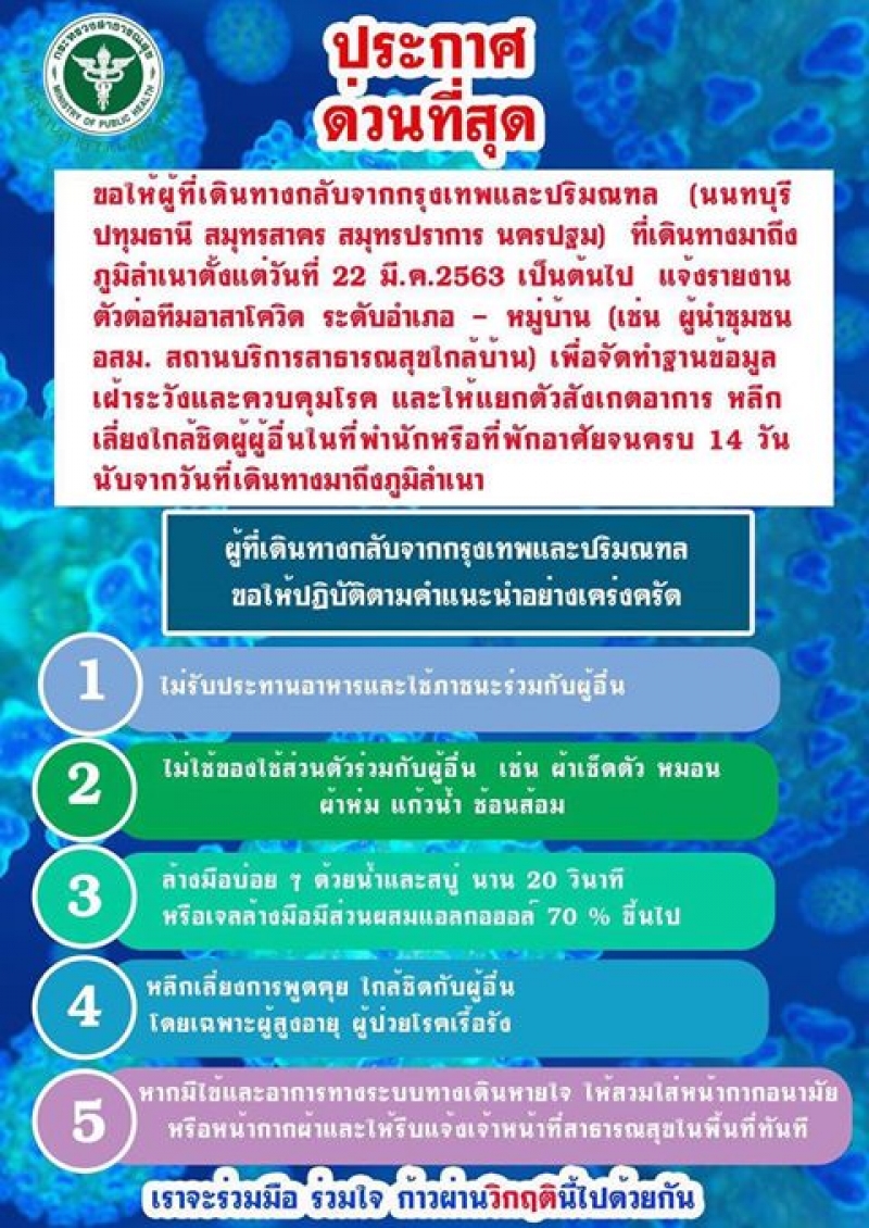 ประกาศด่วนที่สุด ผู้เดินทางกลับจากกรุงเทพและปริมณฑล รายงานตัวต่อ ทีมอาสาโควิด ระดับอำเภอ หมู่บ้าน