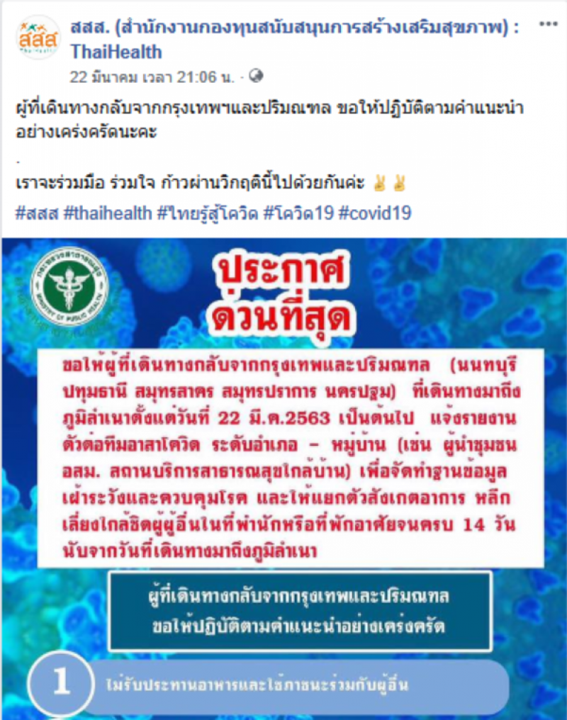 โดยวันที่ 24 มีนาคม 2563 ได้มีเพจที่ใช้ชื่อว่า สสส. (สำนักงานกองทุนสนับสนุนการสร้างเสริมสุขภาพ) : ThaiHealth ได้โพสต์ข้อความอให้ผู้เดิน ทางกลับจากกรุงเทพและปริมณฑล ที่เดินทางถึงภูมิลำเนา ตั้งแต่วันที่ 22 มีนาคม เป็นต้นไป แจ้งรายงานตัวต่อ ทีมอาสาโควิด ระดับอำเภอ หมู่บ้าน (เช่น ผู้นำชุมชน อสม สถานบริการสาธารณสุขใกล้บ้าน) เพื่อจัดทำฐานข้อมูลเฝ้าระวังและควบคุมโรค และให้แยกตัว สังเกตอาการ หลีกเลี่ยงใกล้ชิดผู้อื่นในที่พักอาศัยจนครบ 14 วัน นับจากวันที่เดินทางกลับถึง ภูมิลำเนา โดยผู้ที่เดินทางกลับจากกรุงเทพและปริมณฑล ขอให้ปฏิบัติตามคำแนะนาอย่างเคร่งครัด ดังนี้