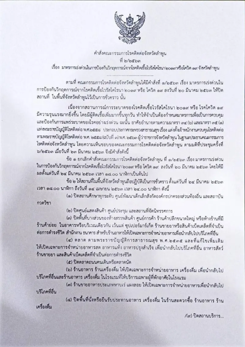 ตามที่ คณะกรรมการโรคติดต่อจังหวัดลําพูนได้มีคําสั่งที่ ๑/๒๕๖๓ เรื่อง มาตรการเร่งด่วนใน การป้องกันวิกฤตการณ์จากโรคติดเชื้อไวรัสโคโรนา ๒๐๑๙ หรือ โควิด ๑๙ ลงวันที่ ๒๐ มีนาคม ๒๕๖๓ ให้ปิด สถานที่ ในพื้นที่จังหวัดลําพูนไว้เป็นการชั่วคราว นั้น