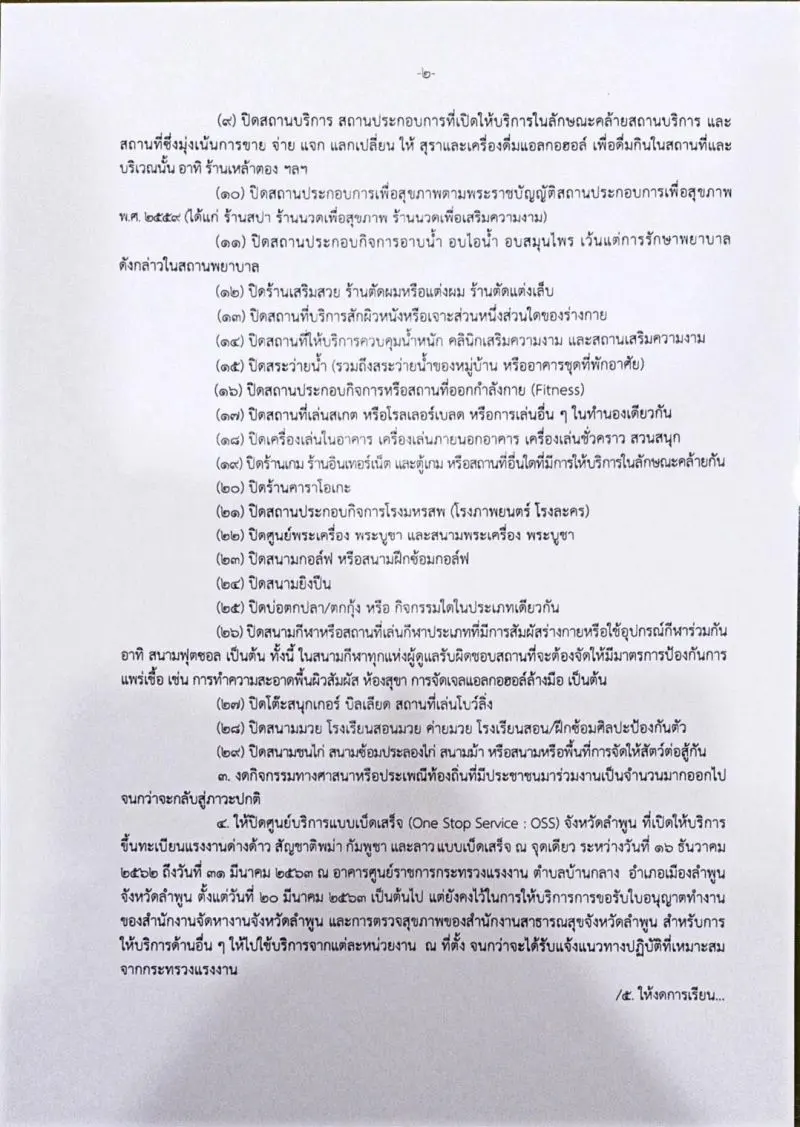 ๔. ให้ปิดศูนย์บริการแบบเบ็ดเสร็จ (One Stop Service : OSS) จังหวัดลําพูน ที่เปิดให้บริการ ขึ้นทะเบียนแรงงานต่างด้าว สัญชาติพม่า กัมพูชา และลาวแบบเบ็ดเสร็จ ณ จุดเดียว ระหว่างวันที่ ๑๖ ธันวาคม ๒๕๖๒ ถึงวันที่ ๓๑ มีนาคม ๒๕๖๓ ณ อาคารศูนย์ราชการกระทรวงแรงงาน ตําบลบ้านกลาง อําเภอเมืองลําพูน จังหวัดลําพูน ตั้งแต่วันที่ ๒๐ มีนาคม ๒๕๖๓ เป็นต้นไป แต่ยังคงไว้ในการให้บริการการขอรับใบอนุญาตทํางาน ของสํานักงานจัดหางานจังหวัดลําพูน และการตรวจสุขภาพของสํานักงานสาธารณสุขจังหวัดลําพูน สําหรับการ ให้บริการด้านอื่น ๆ ให้ไปใช้บริการจากแต่ละหน่วยงาน ณ ที่ตั้ง จนกว่าจะได้รับแจ้งแนวทางปฏิบัติที่เหมาะสม จากกระทรวงแรงงาน