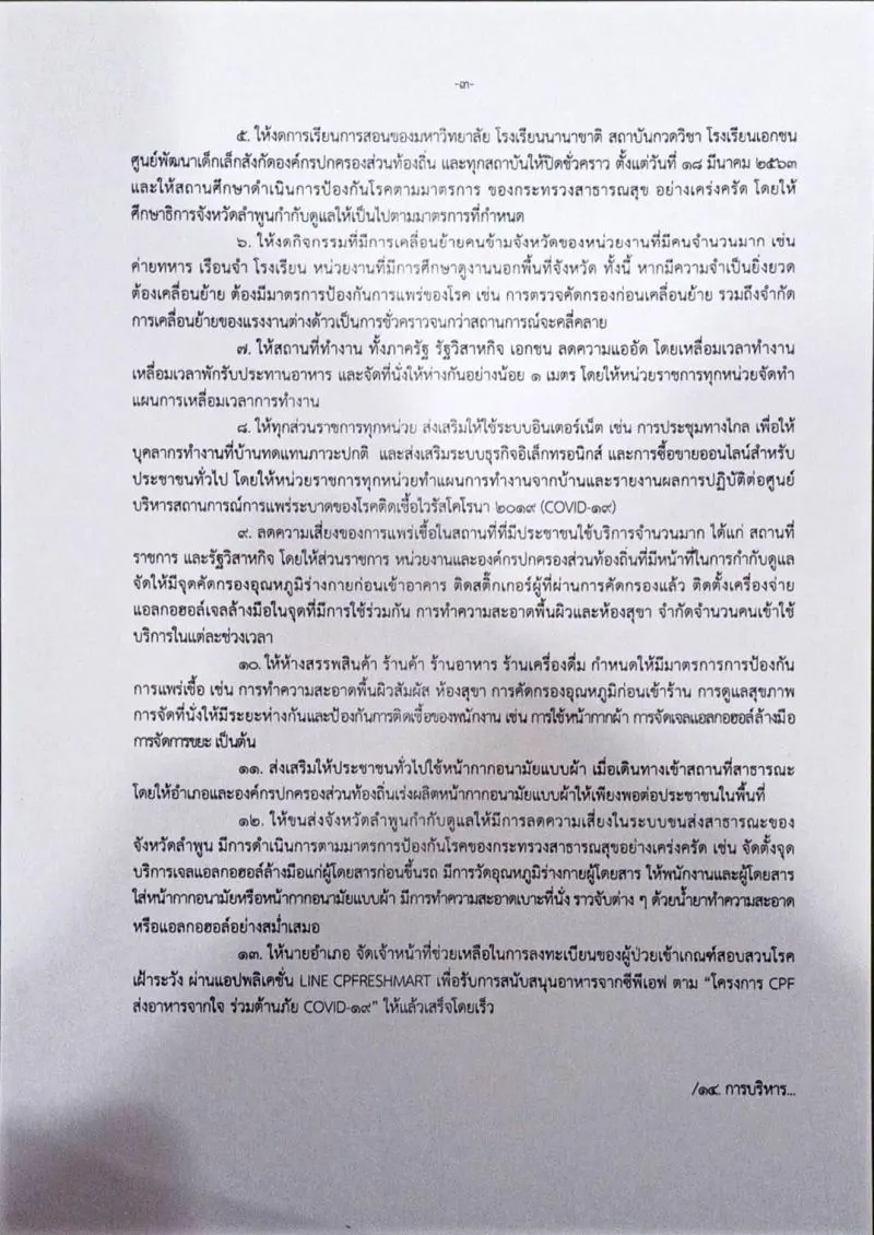 ๕. ให้งดการเรียนการสอนของมหาวิทยาลัย โรงเรียนนานาชาติ สถาบันกวดวิชา โรงเรียนเอกชน ศูนย์พัฒนาเด็กเล็กสังกัดองค์กรปกครองส่วนท้องถิ่น และทุกสถาบันให้ปิดชั่วคราว ตั้งแต่วันที่ ๑๘ มีนาคม ๒๕๖๓ และให้สถานศึกษาดําเนินการป้องกันโรคตามมาตรการ ของกระทรวงสาธารณสุข อย่างเคร่งครัด โดยให้ ศึกษาธิการจังหวัดลําพูนกํากับดูแลให้เป็นไปตามมาตรการที่กําหนด