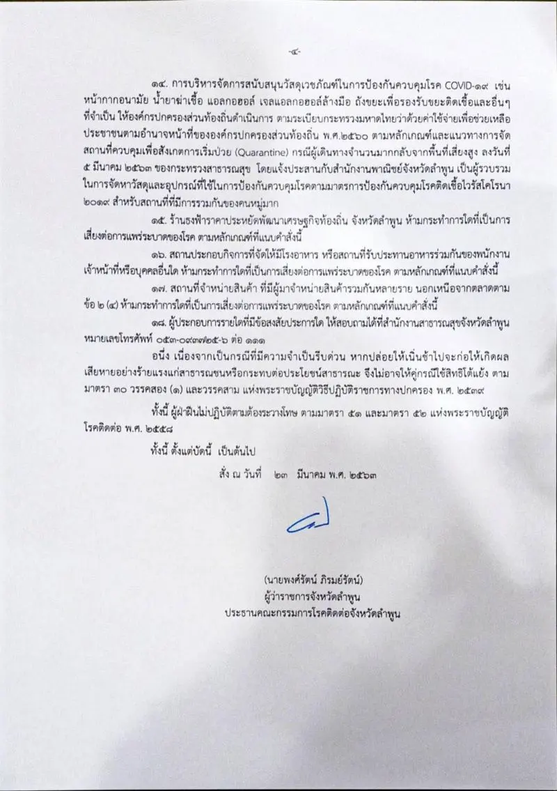 เนื่องจากสถานการณ์การระบาดของโรคติดเชื้อไวรัสโคโรนา ๒๐๑๔ หรือ โรคโควิด ๑๙ มีความรุนแรงมากยิ่งขึ้น โดยมีผู้ติดเชื้อเพิ่มมากขึ้นทุกวัน ทําให้จําเป็นต้องกําหนดมาตรการเพื่อเป็นการควบคุม และป้องกันการแพร่ระบาดของโรคอย่างเร่งด่วน ฉะนั้น อาศัยอํานาจตามความมาตรา ๓๔ (๒) และมาตรา ๓๕ (๑) แห่งพระราชบัญญัติโรคติดต่อ พ.ศ.๒๕๕๘ ประกอบประกาศกระทรวงสาธารณสุขเรื่อง แต่งตั้งเจ้าพนักงานควบคุมโรคติดต่อ ตามพระราชบัญญัติโรคติดต่อ พ.ศ. ๒๕๕๘ (ฉบับที่ ๓) พ.ศ. ๒๕๖๓ ผู้ว่าราชการจังหวัดลําพูน ในฐานะประธานคณะกรรมการ โรคติดต่อจังหวัดลําพูน โดยความเห็นชอบของคณะกรรมการโรคติดต่อจังหวัดลําพูน ตามมติที่ประชุมครั้งที่ ๖/๒๕๖๓ เมื่อวันที่ ๒๓ มีนาคม ๒๕๖๓ จึงมีคําสั่งดังนี้