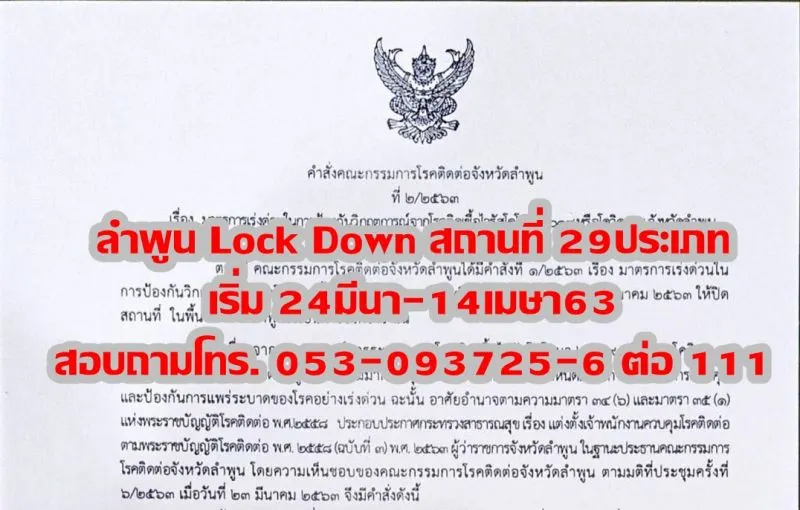 ลำพูน Lock Down สถานที่ 29ประเภท เริ่ม 24มีนา-14เมษา63 สอบถามโทร.053-093725-6 ต่อ 111