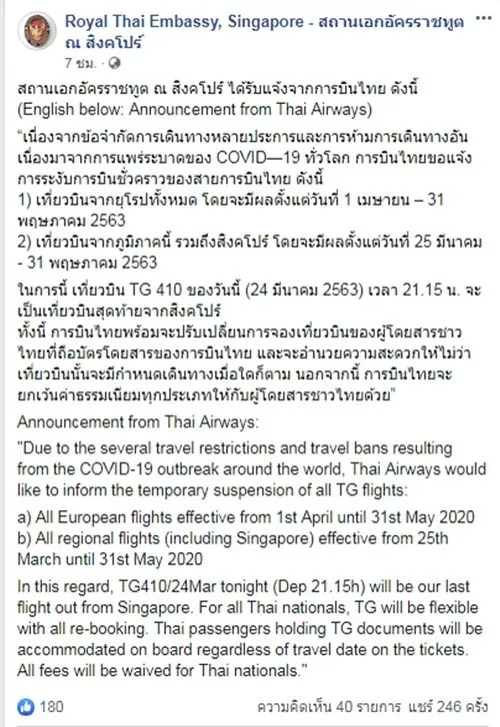 เมื่อวันที่ 24 มี.ค. 2563 – เพจเฟซบุ๊ก Royal Thai Embassy, Singapore – สถานเอกอัครราชทูต ณ สิงคโปร์ แจ้งว่า สถานเอกอัครราชทูต ณ สิงคโปร์ ได้รับแจ้งจากการบินไทย ดังนี้