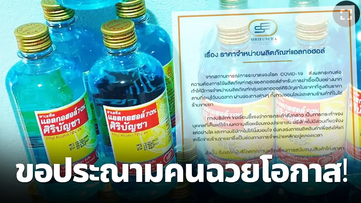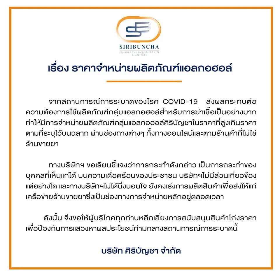 ในช่วงวิกฤตโควิดนี้ ทำให้ประชาชนมีความต้องการในการใช้แอลกอฮอล์ เจลล้างมือ รวมทั้งหน้ากากอนามัย เป็นอย่างมาก ทำให้พ่อค้าแม่ค้าบางกลุ่ม ฉวยโอกาสขึ้นราคาแอลกอฮอล์เพิ่มเป็นหลายเท่าตัว โดยล่าสุดทาง บ.ศิริบัญชา ผู้ผลิตแอลกอฮอล์ รายใหญ่ของไทยได้ออกมาชี้แจงผ่านทางเพจ Siribuncha ศิริบัญชา ระบุว่า