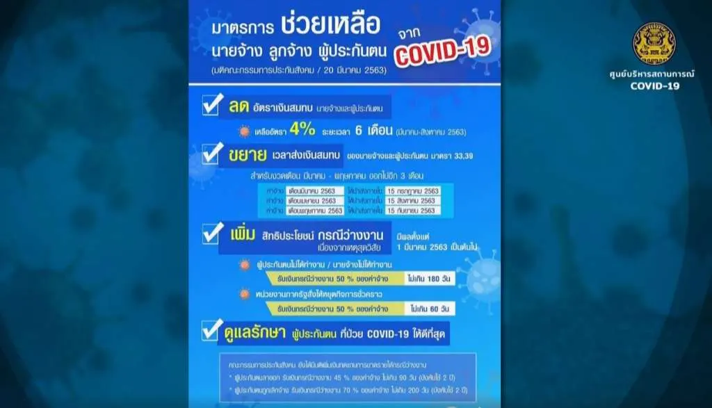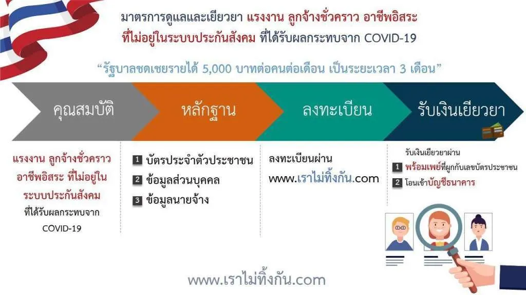 สำหรับมาตรการดูแลและเยียวยาผลกระทบจาก ไวรัสโควิด-19 ต่อเศรษฐกิจไทยทั้งทางตรงและทางอ้อม นั้น เมื่อวานนี้ 24 มี.ค.63 ทาง นาย ลวรณ แสงสนิท ผู้อำนวยการสำนักงานเศรษฐกิจการคลัง (สศค.) กล่าวว่า สำหรับกลุ่มแรงงานลูกจ้างชั่วคราวอาชีพอิสระที่ไม่อยู่ในระบบประกันสังคม สามารถรับเงินช่วยเหลือ 5,000 บาทจำนวน 3 เดือน ในการลงทะเบียนเว็บไซต์ www.เราไม่ทิ้งกัน.com ผ่าน 4 ขั้นตอน คาดเว็บจะเเล้วเสร็จเปิดให้ลงทะเบียนวันที่ 28 มี.ค.63