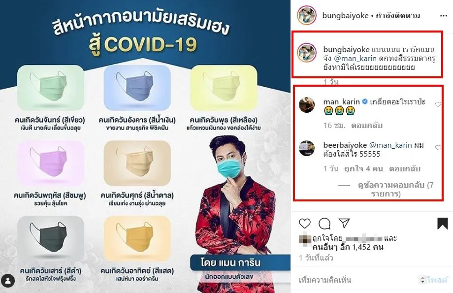 บุ้ง ใบหยก สุดหนักใจ หลัง แมน การิน แนะให้ใส่หน้ากากอนามัย สีมงคลตามวันเกิด สู้โควิด19