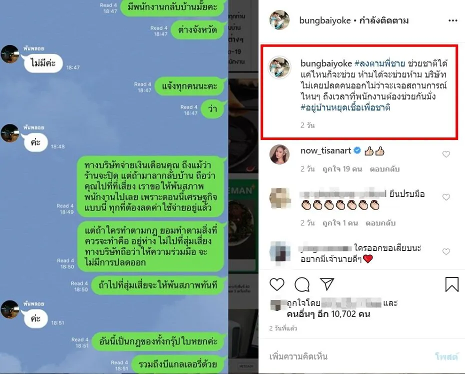 เเละก่อนหน้านี้ บุ้ง สะธี ใบหยก ภรรยาของ เวฟ สาริน ทายาทตึกใบหยก นั้นก็โพสต์ภาพการสนทนาผ่านไลน์บนอินสตราแกรมส่วนตัวถึงพนักงานว่า หากใครลากลับต่างจังหวัดขอไล่ออก แต่ถ้าใครปฏิบัติตามกฎ อยู่ห่าง ไม่ไปที่สุ่มเสี่ยง บริษัทถือว่าให้ความร่วมมือ จะไม่มีการปลดออก
