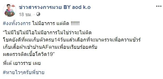 เพจเฟซบุ๊กโพสต์ข้อความระบุว่า “งงทั้งวงการ ไม่มีอาการ แต่ติด !!!!!! “ไม่มีไข้ไม่มีไอไม่มีอาการไม่ใช่ว่าจะไม่ติด โชคยังดีที่ผมเก็บตัวครบ14วันแล้วเลือกที่จะมาตรวจเพื่อความชัวร์ เก็บเสื้อผ้าเข้าบ้าน AF ตามเพื่อนเรียบร้อยครับ ผลตรวจติดเชื้อโควิด19” พี่เต้ เยาวราช เผย #หายไวๆครับพี่ชาย