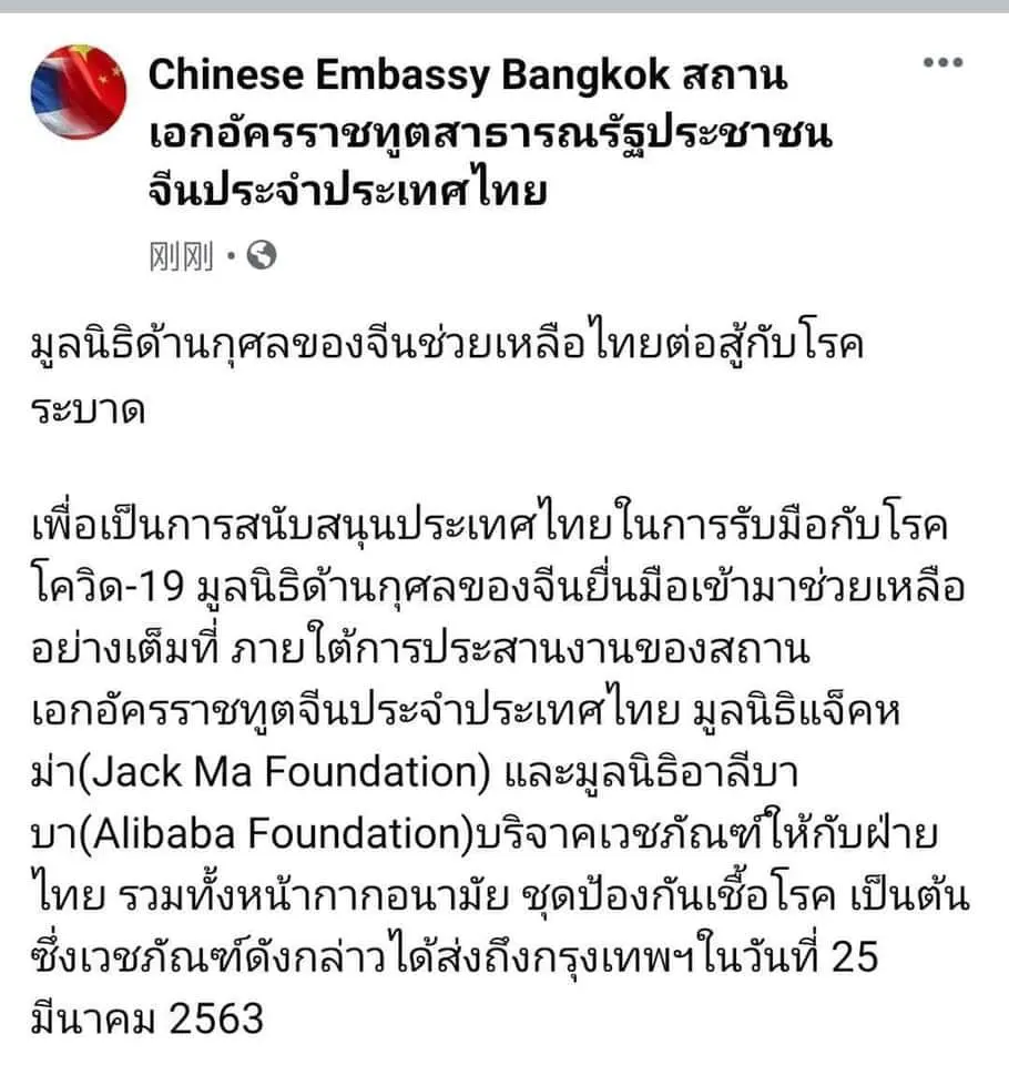 มูลนิธิด้านกุศลของจีนช่วยเหลือไทยต่อสู้กับโรคระบาด