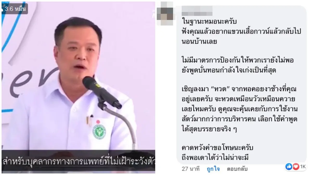 ทั้งนี้ข้อความระบุว่า ในฐานะหมอนะครับ ฟังคุณแล้วอยากแขวนเสื้อกาวน์แล้วกลับไปนอนบ้านเลยไม่มีมาตรการป้องกันให้พวกเรายังไม่พอยังพูดบั่นทอนกำลังใจเก่งเป็นที่สุดเชิญลงมา “หวด” จากหอคอยงาช้างที่คุณอยู่เลยครับ