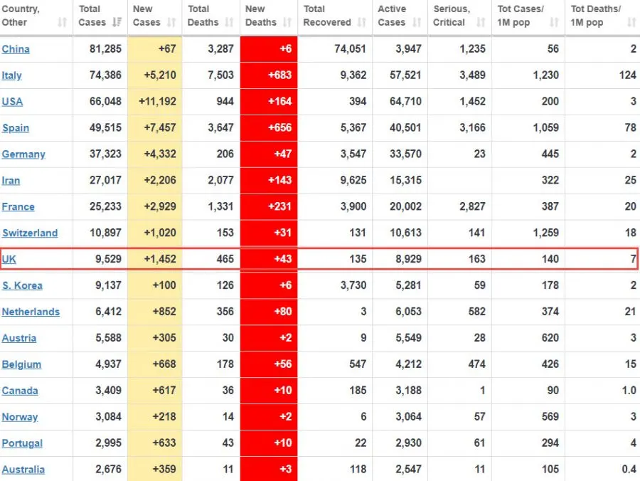 ประเทศอังกฤษถือเป็นอีกหนึ่งชาติโดนไวรัสโควิดเล่นงานอย่างหนักอีกประเทศซึ่งข้อมูลผู้ติดเชื้อของวันที่ 26 มีนาคม เวลา 11.11 น.(ตามเวลาประเทศไทย) ได้เผยยอดผู้ติดเชื้อสะสมล่าสุด 9,529 ราย (เพิ่มขึ้นล่าสุด 1,452 ราย ) เสียชีวิต 465 ราย (เพิ่มขึ้น 43 ราย) และรักษาหายได้เพียง 135 ราย
