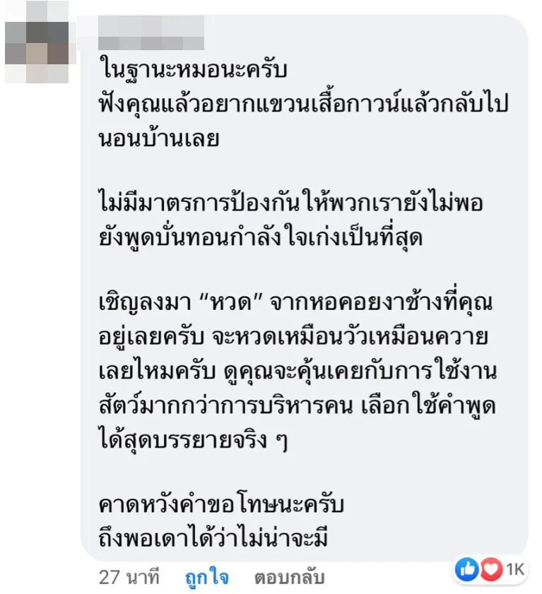 และตนได้เตือนบุคลากรทางการแพทย์ทุกคนว่า ในฐานะที่เป็นข้าราชการสาธารณสุข ต้องปฏิบัติเป็นตัวอย่างแก่ประชาชน เพราะมาตรการที่ออกไปให้ประชาชนปฏิบัตินั้น เป็นมาตรการที่สาธารณสุข เป็นผู้กำหนดทั้งนั้น ซึ่งประเด็นที่ต้องการสื่อสารมีเพียงเท่านี้ ไม่มีเจตนาที่จะตำหนิแพทย์ หรือ บุคลากรทางการแพทย์ที่ทำงานหนัก อยู่ในขณะนี้ มีแต่ให้กำลังใจกันทุกวัน แต่หากการสื่อสารทำให่้เข้าใจผิด ก็ขอชี้แจงให้ทราบตามนี้