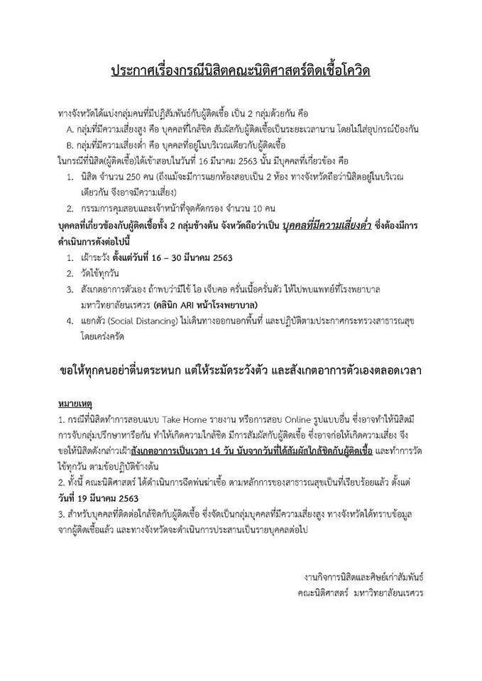 ทั้งนี้ นิสิตที่ใกล้ชิด มีการสัมผัสผู้ติดเชื้อ ซึ่งอาจก่อให้เกิดความเสี่ยงขอให้นิสิตดังกล่าวเฝ้าสังเกตอาการเป็นเวลา 14วัน นับจากวันที่ได้สัมผัสใกล้ชิดผู้ติดเชื้อ ซึ่งทางคณะได้ทำการฉีดพ่อฆ่าเชื้อตามหลักของ สธ.เมื่อวันที่ 19 มี.ค.แล้ว