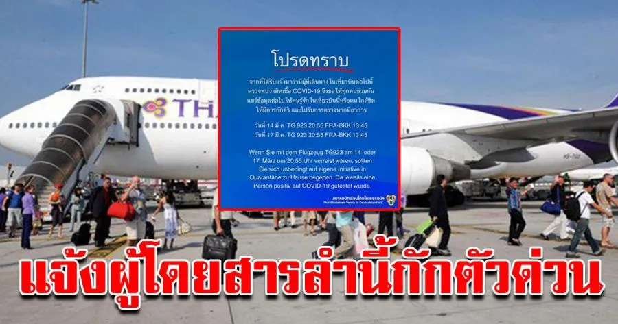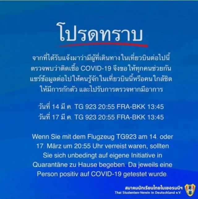 คือ TG923 ที่เดินทางมาตอน 20.55 น ถึงเวลา 13 45 น วันที่ 14 มีนาคม และ วันที่ 17 มีนาคม มีผู้ติด COVID โดยขอให้แชร์ข้อมูลให้คนรู้จักในเที่ยวบินนี้หรือคนใกล้ชิดให้มีการกักตัว และไปรับการตรวจหากมีอาการ