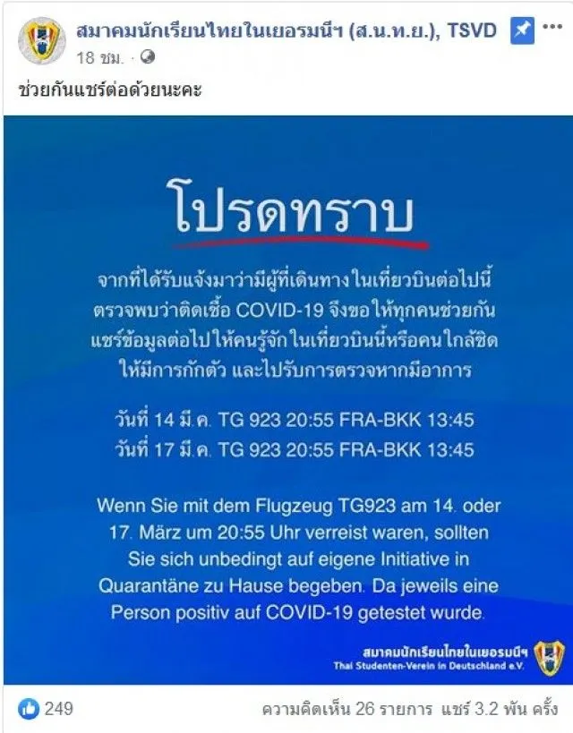ล่าสุด ทางด้านเพจ สมาคมนักเรียนไทยในเยอรมนีฯ TSVD ได้โพสต์ประกาศตามหาผู้โดยสารที่เดินทางจากแฟรงก์เฟิร์ตมากรุงเทพฯ หลังมีการระบุแล้วว่า มีผู้โดยสารที่เดินทางมาในเที่ยวบินนี้