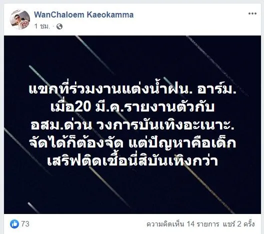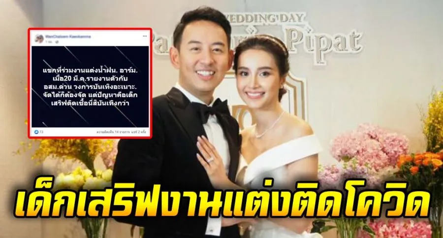 ทางผู้จัดงานป้องกันอย่างดี แต่ล่าสุดแขกที่ร่วมงานแต่งน้ำฝน-อาร์ม เมื่อวันที่ 20 มี.ค.รายงานตัวกับอสม.ด่วนจัดได้ก็ต้องจัด แต่ปัญหาคือ เด็กเสิร์ฟติดแล้ว ทำให้หลายคนสอบถามไปทางนางเอกสาวของเราว่าเป็นอย่างไรบ้าง