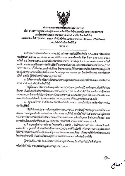 - คนบุรีรัมย์ที่เดินทางออก และเมื่อเดินทางกลับเข้ามาจังหวัดบุรีรัมย์ ให้ไปรายงานตัวต่อศูนย์คัดกรองโควิด19 เว้นแต่คนนั้นจะผ่านการคัดกรองแล้ว