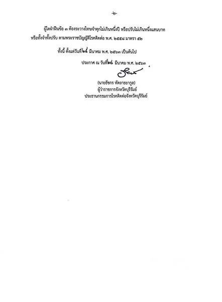 ผู้ใดฝ่าฝืนตามข้อ 2 มีโทษปรับไม่เกิน 20,000 บาท ตามพระราชบัญญัติโรคติดต่อ พ.ศ. 2558 มาตรา 51 มีผลตั้งแต่วันที่ 25 มีนาคม 2563 เป็นต้นไป