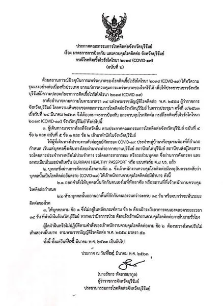 ล่าสุด เพจเฟซบุ๊ก ลุงเนวิน ได้โพสต์ประกาศคณะกรรมการโรคติดต่อจังหวัดบุรีรัมย์ ฉบับที่ 5 และ ฉบับที่ 6 ถึงมาตรการป้องกันและแนวทางปฏิบัติ กรณีติดเชื้อไวรัสโควิด 19 ที่จังหวัดบุรีรัมย์ โดยเป็นประกาศของ นายธัชกร หัตถาธยากูล ผู้ว่าราชการจังหวัดบุรีรัมย์ ถึงแนวทางป้องกันและมาตรการควบคุมต่างๆ ดังนี้