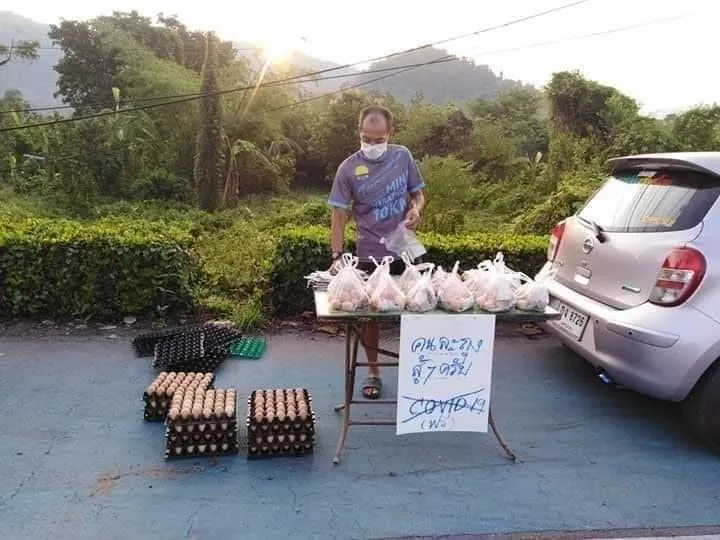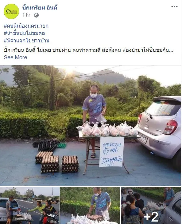 อย่างเมื่อ 8โมงเช้าวันที่ 25มี.ค63 มีคนตาดีถ่ายภาพจ.ส.ต.ประเสริฐ สดสมศรี จอดรถ อยู่ริมถนน หมู่ที่ 3 บ้านนางรอง ต.หินตั้ง อ.เมือง จ.นครนายกหยิบไข่ไก่ ใส่ถุง วางบนโต๊ะ พร้อมเขียนป้ายบอกว่า แจกไข่ สู้ COVID-19 ในยามที่เกิดวิกฤตโรคร้ายระบาด