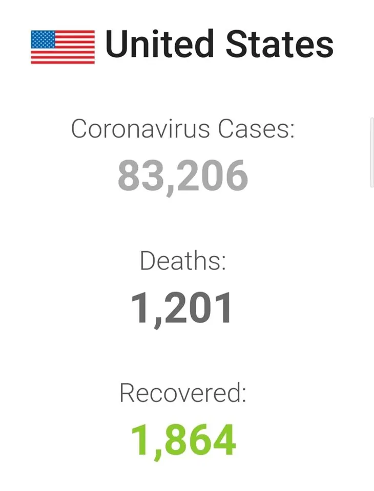 27 มี.ค. มหาวิทยาลัยจอห์น ฮอปกินส์ รายงานว่า ขณะนี้ทั่วโลกมีผู้ติดเชื้อไวรัสโควิด-19 จำนวน 526,044 คน และมีผู้เสียชีวิต 23,709 ราย โดยสหรัฐขึ้นอันดับ 1 ประเทศที่มีผู้ติดเชื้อมากที่สุด โดยวันนี้ ติดเชื้อเพิ่มอีก เพิ่ม 14,995 ราย ทำให้ยอดพุ่งเป็น 83,206 คน มีผู้เสียชีวิต 1,201 ราย รองลงมาคือ จีน 81,782 คน ตามมาด้วยอิตาลี 80,589 คน, สเปน 56,347 คน