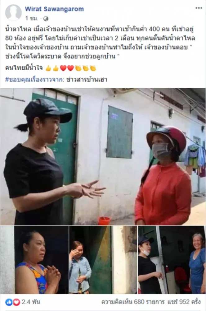 เป็นอีกหนึ่งเรื่องราวที่คนบนโลกออนไลน์แชร์ออกไปเป็นจำนวนมาก หลังจากผู้ใช้เฟซบุ๊กชื่อ Wirat Sawangarom ได้โพสต์ภาพของผู้เช่าโดยระบุข้อความว่า น้ำตาไหล เมื่อเจ้าของบ้านเช่าให้คนงานที่หาเช้ากินค่ำ 400 คน ที่เช่าอยู่ 80 ห้อง อยู่ฟรี โดยไม่เก็บค่าเช่าเป็นเวลา 2 เดือน ทุกคนตื้นตันน้ำตาไหลในน้ำใจของเจ้าของบ้าน ถามเจ้าของบ้านทำไมถึงให้ เจ้าของบ้านตอบ ช่วงนี้โรคโควิดระบาด จึงอยากช่วยลูกบ้าน คนไทยมีน้ำใจ