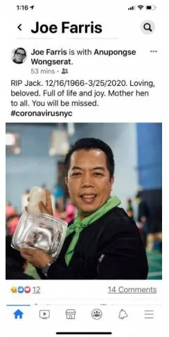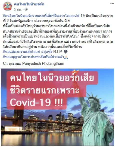 พร้อมทั้งได้ข้อความระบุว่า คนไทยในนิวยอร์กรายแรกที่เสียชีวิต covid-19 นับเป็นคนไทยรายที่ 2 ในสหรัฐอเมริกา ต่อจากกรุงวอชิงตัน ดีซี