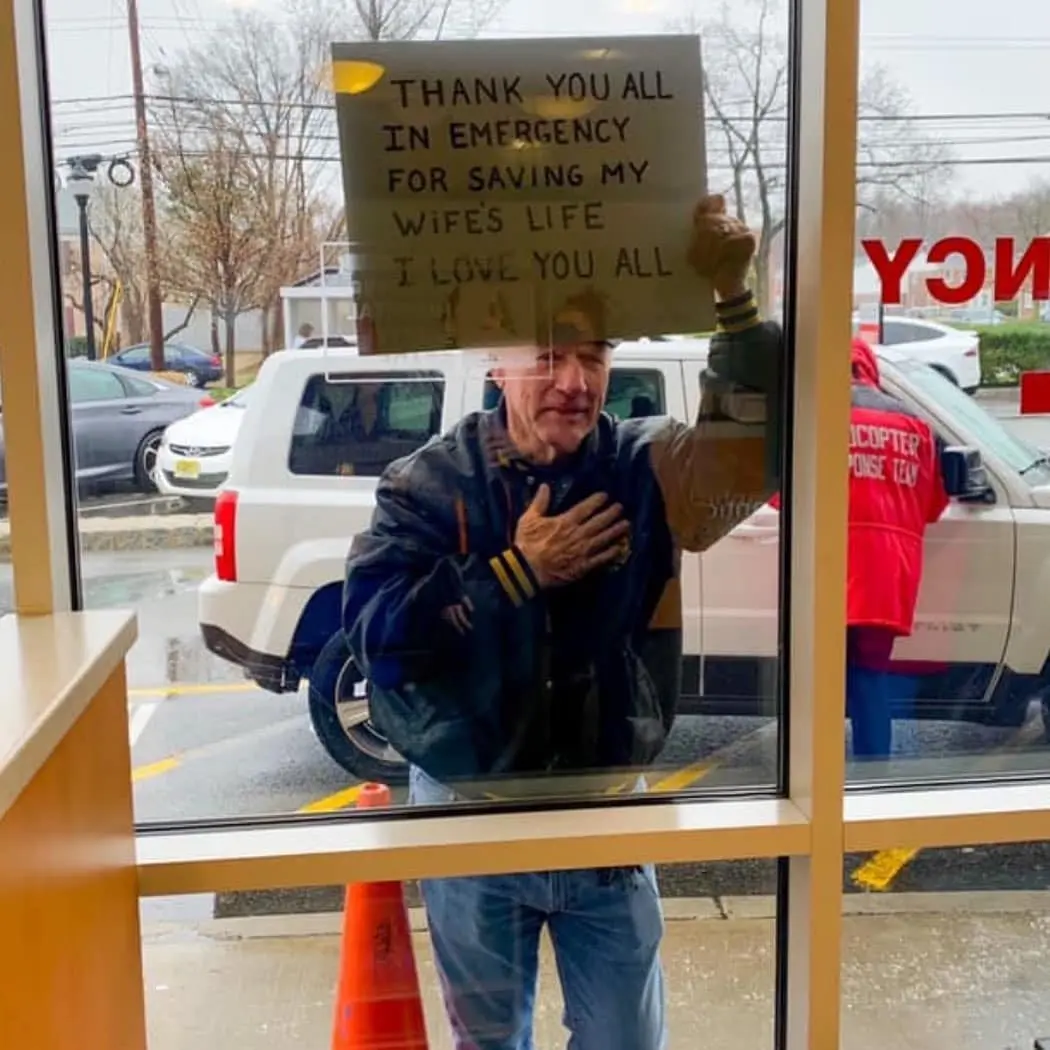 3- แอลลิสันเห็นชายคนหนึ่งยืนอยู่ด้านนอก เมื่อเห็นเธอหันมา เขาก็ชูป้ายในมือขึ้น ข้อความบนป้ายเขียนว่า “ขอบคุณพวกคุณทุกคนที่ช่วยชีวิตภรรยาของผม ผมรักพวกคุณ”