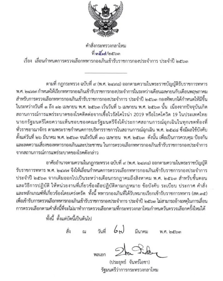 พลเอกประยุทธ์ จันทร์โอชา นายกรัฐมนตรี และรัฐมนตรีว่าการกระทรวงกลาโหม ได้ลงนามคำสั่งกระทรวงกลาโหม ที่ 357/2563 เรื่องเลื่อนกำหนดการตรวจเลือกทหารกองเกิน เข้ารับราชการกองประจำการ ปี 2563 โดยระบุว่า ตามที่กองทัพบก ได้กำหนดให้มีการตรวจเลือกทหารกองเกิน เข้ารับราชการกองประจำการ ระหว่างวันที่ 1 ถึง 12 เมษายนนั้น เนื่องจากปัจจุบัน เกิดสถานการณ์การแพร่ระบาดของโรคติดต่อจากเชื้อไวรัสโควิด-19 ในประเทศไทย นายกรัฐมนตรีโดยความเห็นชอบของคณะรัฐมนตรีได้ประกาศสถานการณ์ฉุกเฉินทั่วประเทศ ตาม พ.ร.ก.บริหารราชการในสถานการณ์ฉุกเฉิน ซึ่งมีผลเมื่อวันที่ 26 มีนาคม - 30 เมษายน ดังนั้นเพื่อเป็นการควบคุมป้องกันและลดความเสี่ยงของทหารกองเกินและประชาชน จึงให้เลื่อนกำหนดการตรวจเลือกทหารกองเกินเข้ารับราชการกองประจำการประจำปี 2563 จากเดิมออกไป เป็นระหว่างเดือนกรกฎาคมถึงสิงหาคม 2563 แทน