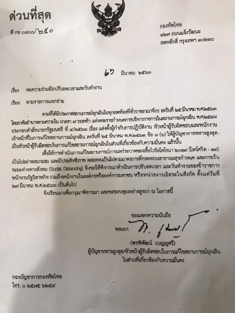 27 มี.ค. 2563 พล.อ.พรพิพัฒน์ เบญญศรี ผู้บัญชาการทหารสูงสุด (ผบ.ทสส.) ในฐานะหัวหน้าศูนย์ปฏิบัติการแก้ไขสถานการณ์ฉุกเฉินด้านความมั่นคง (ศปม.) ลงนามหนังสือวันที่ 26 มี.ค.63 แจ้งไปยัง 26 หน่วนงาน