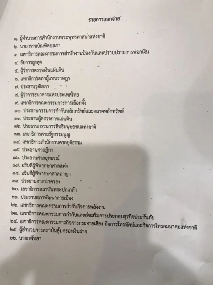 ประธานผู้ตรวจการแผ่นดิน , ประธานกรรมการสิทธิมนุษยชนแห่งชาติ , เลขาธิการศาลรัฐธรรมนูญ , เลขาธิการสำนักงานศาลยุติธรรม , ประธานศาลฎีกา , ประธานศาลอุทธรณ์ , อธิบดีผู้พิพากษาศาลแพ่ง , อธิบดีผู้พิพากษาศาลอาญา , ประธานศาลปกครอง