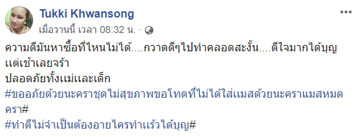 โดยเธอได้บอกเล่าเหตุการณืนี้ว่า… ความดีมันหาซื้อที่ไหนไม่ได้….กวาดดีๆไปทำคลอดชะงั้น….ดีใจมากได้บุญเเต่เช้าเลยจ้า ปลอดภัยทั้งเเม่เเละเด็ก ขออภัยด้วยนะคะชุดไม่สุขภาพขอโทษที่ไม่ได้ใส่แมสด้วยนะคะแมสหมด ทำดีไม่จำเป็นต้องอายไครทำเเล้วได้บุญ