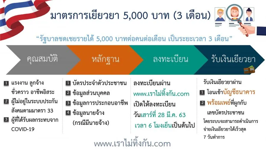 เริ่มวันนี้ 28 มีนาคม 2563 สำหรับการร่วมลงทะเบียนขอรับเงินจากมาตรการเยียวยา 5,000 บาท เป็นเวลา 3 เดือน ซึ่งรัฐบาลจะช่วยชดเชยรายได้แก่ผู้ได้รับผลกระทบจาก #covid-19 ช่วยเหลือลูกจ้างของสถานประกอบการ หรือผู้ได้รับผลกระทบ ของการแพร่ระบาดจากเชื้อไวรัสโควิด-19 โดยรัฐบาลจะเปิดให้ลงทะเบียนเข้าร่วมมาตรการได้ในวันนี้ คือ วันเสาร์ที่ 28 มีนาคม 2563 เวลา 6 โมงเย็น หรือ 18.00 น. เป็นต้นไปและจะเปิดตลอด 24 ชั่วโมง