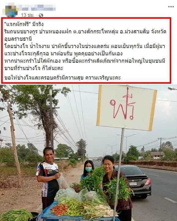 โดยงานนี้ ผู้ใช้เฟซบุ๊ครายหนึ่ง ได้โพสต์ระบุข้อความว่า “แจกผักฟรี” มีจริง