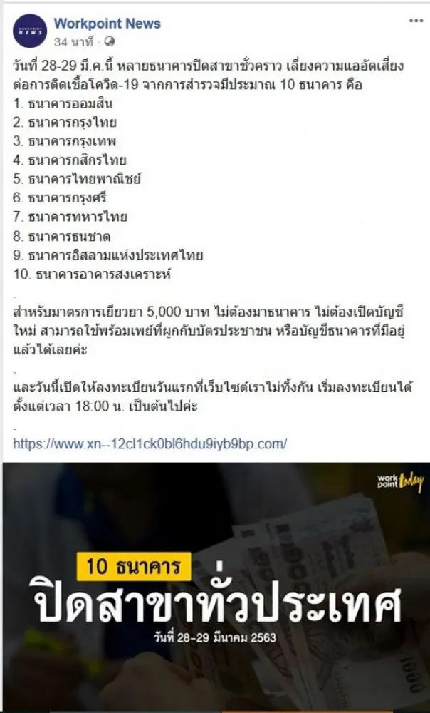 ทางด้านธนาคารจึงออกมาประกาศปิด ธนาคาร 10 ธนาคารชั่วคราวเนื่องจากป้องกันการติด COVID โดยทางเพจ Workpoint News ได้โพสต์ พร้อมระข้อความว่า