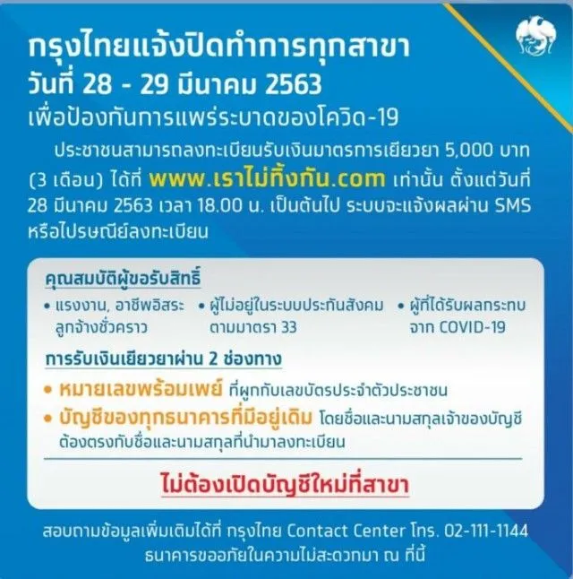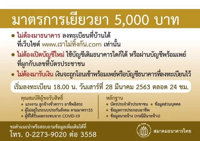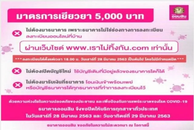 จากกรณีที่รัฐได้มีมาตราการเยียวยาผู้ที่ได้รับผลกระทบจาก COVID โดยให้ผู้ที่เข้าข่ายและได้รับผลกระทบ เดือนละ 5000 บาท โดยให้ลงทัเบียนผ่านทางเว็บไซต์ www.เราไม่ทิ้งกัน.com ซึ่งอาจจะมีบางส่วนที่ยังไม่เข้าใจและอาจจะเดินทางไปธนาคาร